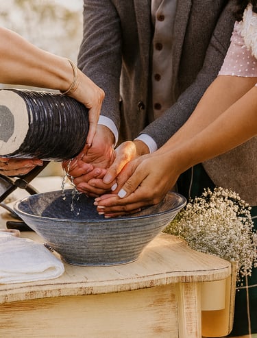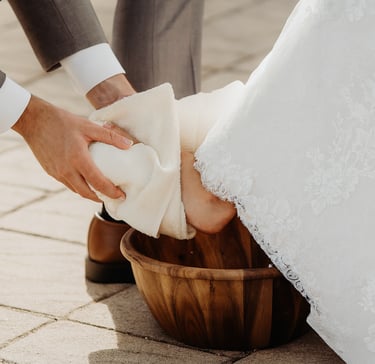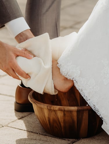 Lavagem dos Pés: O casal lava, à vez, os pés um do outro mergulhando-os num recipiente de água e limpa-os com uma toalha branca.